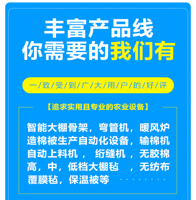 本公司設(shè)備齊全,可生產(chǎn)智能大棚骨架,彎管機(jī),暖風(fēng)爐等農(nóng)業(yè)設(shè)備,另制造棉被生產(chǎn)自動化設(shè)備,自動上料機(jī),輸棉機(jī),絎縫機(jī)等。質(zhì)量可靠,注重創(chuàng)新。公司擁有雄厚的實(shí)力,先進(jìn)的生產(chǎn)線,豐富的經(jīng)驗(yàn),可根據(jù)客戶的要求定做高,中,低檔大棚氈,無紡布,無膠棉,覆膜氈,保溫被等,車間日生產(chǎn)新型棉被10000平方米以上,能滿足各種客戶的需求,新型保溫被產(chǎn)品在國內(nèi)研發(fā)中始終保持在前列。